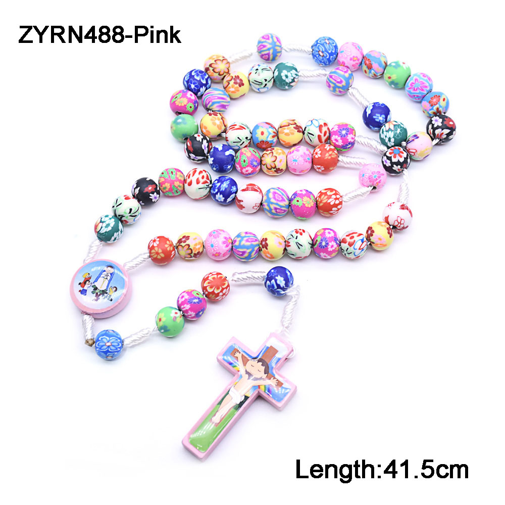 Colored Soft Clay Handmade Rose Beaded Necklace Children's Cross Prayer Beads Rosary